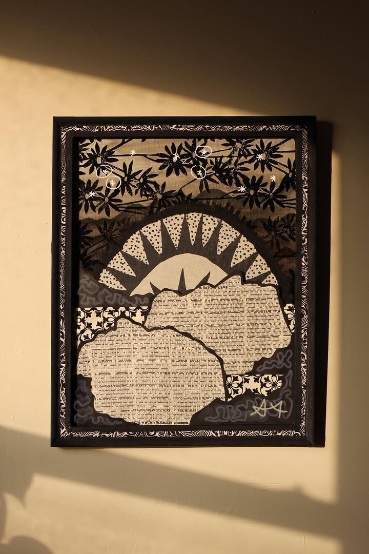 TWO SILHOUETTES // Binding Tape, Wallpaper, Shower Curtain, Acrylic Paint, Card-stock, Fabric